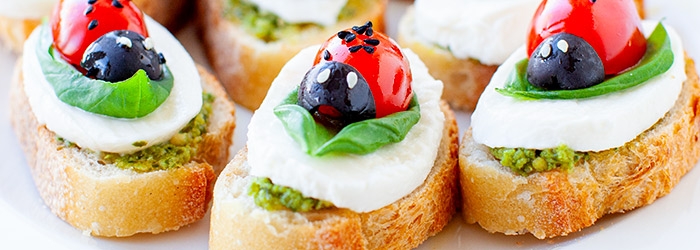 Kanapeczki z bagietki smarujemy pesto, potem dodajemy mozzarellę, bazylię i pomidorki z czarnymi oliwkami. Potrzebny też będzie biały sezam (na oczka) i czarnusza (na kropki).