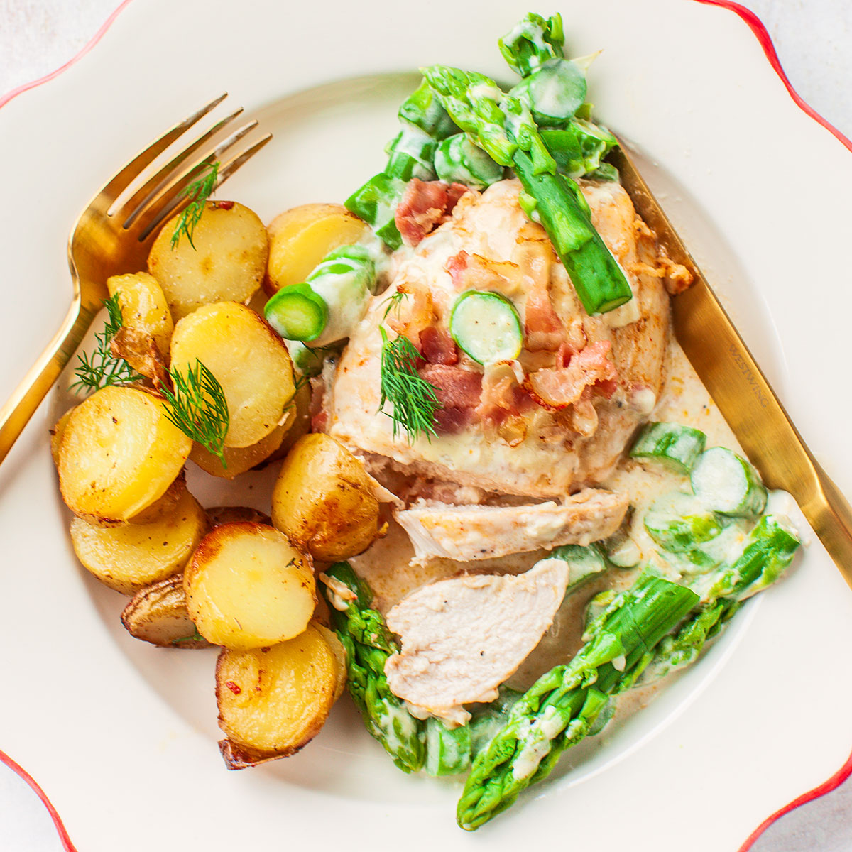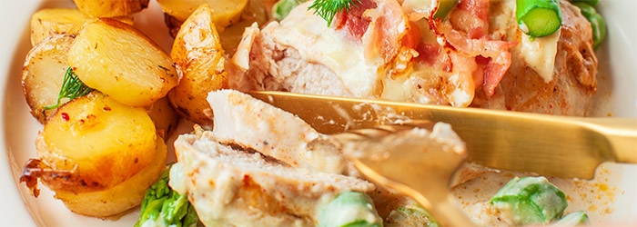 Kurczak zapiekany ze szparagami i sosem serowym