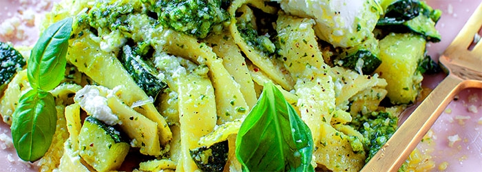 Smaczny makaron z bazyliowym pesto oraz ricottą, z warzywnym dodatkiem w postaci podsmażonej cukinii. Coś dobrego dla osób unikających mięsa i poszukujących ciekawych smaków i połączeń składników.