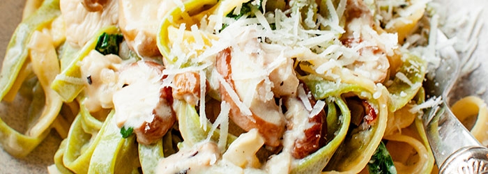 Makaron z grzybami leśnymi, kurczakiem i szpinakiem