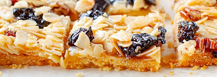 Kruchutkie, maślane ciasto z płatkami migdałów zatopionymi w pysznej masie z orzechami pekan i suszonymi śliwkami. Wszystko w formie mazurka, który poleca się na nadchodzące Święta. Możecie dodać inne bakalie, np. suszone morele zamiast śliwek - jeśli akurat takie posiadacie.