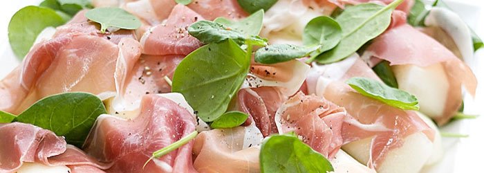 Prosciutto e Melone, czyli Melon z szynką parmeńską. Klasyczna przekąska z kuchni włoskiej. Prosta i wyborna. Tym razem na liściach młodego szpinaku. Sos balsamiczny podaję obok w dzbanuszku.