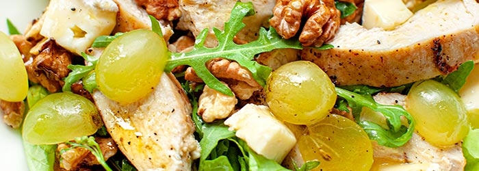 Jak wpleść w codzienne posiłki sezonowe produkty? Przykładowo można to zrobić przygotowując sezonowe sałatki, jak ta dzisiaj prezentowana, z winogronami. Orzechy włoskie, pożywny filet z kurczaka, rukola oraz delikatny serek brie. Do tego lekki winegret i gotowe! Tego typu sałatkę można zrobić w domu na lunch, jako posiłek do pracy czy na kolację.