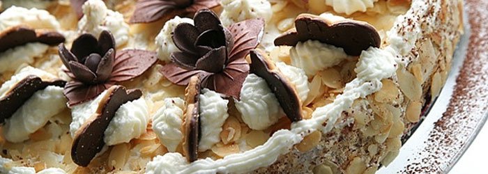 Tort Malakoff - Austriacki torcik migdałowy bez pieczenia. Z gotowych biszkoptów, nasączonych winnym ponczem, przełożonych kwaskowatym dżemem porzeczkowym i budyniowym kremem waniliowym. Udekorowany płatkami migdałowymi i ciasteczkami.