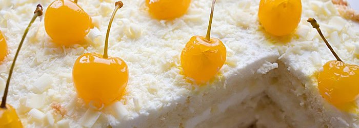Tort Malibu - Puszysty biszkopt z bitą śmietaną o smaku kokosowego rumu Malibu oraz białą czekoladą.