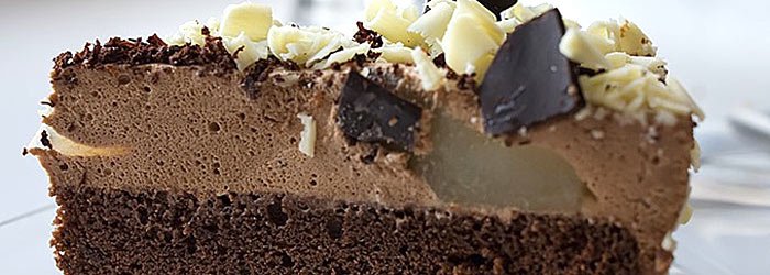 Tort Gutenberg - Ciasto czekoladowe pokryte gruszkami zatopionymi w puszystym i lekkim musie czekoladowym z mlecznej i gorzkiej czekolady.