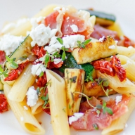 Penne z pieczarkami, szynką i suszonymi pomidorami