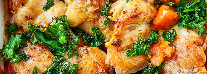 Udka kurczaka pieczone z batatami (lub marchewką) i jarmużem