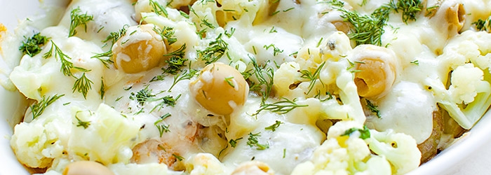 Zapiekanka, w której znajdziemy cały zestaw obiadowy: mięso, ziemniaki (lub makaron) i dodatek warzywny. Pieczone w piekarniku warstwami: filety kurczaka, ugotowane ziemniaki lub makaron oraz kalafior. Wszystko polane sosem z gorgonzolą, posypane mozzarellą i zapieczone. Po upieczeniu posypujemy całość koperkiem.