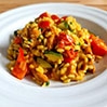 Risotto z cukinią, papryką, kurkami i pomidorami. Pyszne i soczyste, z dużą ilością warzyw, doprawione tymiankiem, estragonem, kurkumą, kminem i ostrą papryką. Najpierw podsmażamy warzywa i kurki, następnie dodajemy ryż, przyprawy i gotujemy wszystko w stopniowo dodawanym bulionie. Na koniec doprawiamy gorgonzolą, która po roztopieniu i wmieszaniu w potrawę bardzo podnosi walory smakowe potrawy. Dla chętnych risotto można wzbogacić o podsmażoną pierś kurczaka; możemy też dodać świeże zioła.