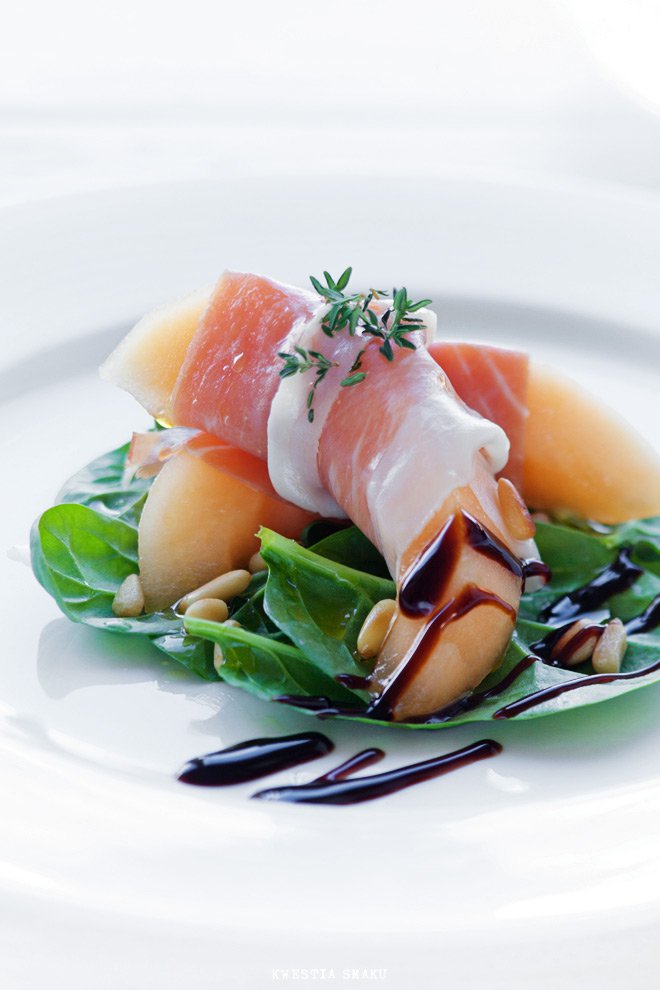 admin Sałatka z melonem w szynce parmeńskiej na szpinaku
