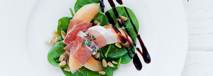 Sałatka z melonem w szynce parmeńskiej na szpinaku