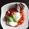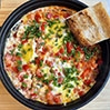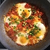 - Do podsmażonych pomidorów wbić jajka, doprawić solą. Przykryć i gotować przez około 3 minuty lub do czasu aż białka jajek będą ścięte. Podawać ze świeżą bazylią i bagietką.