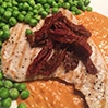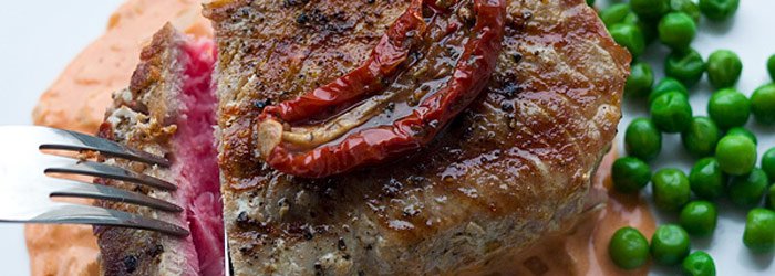 - Talerze ogrzać (np. zanurzyć je w zlewie z gorącą wodą na kilka minut a następnie zawinąć w ręcznik lub ściereczkę kuchenną). Sos podgrzać i połowę rozsmarować na talerzach, ułożyć eskalopki z tuńczyka, udekorować je suszonymi pomidorami, polać resztą sosu. Podawać z zielonym groszkiem. Opcjonalnie z białym ryżem i brokułami zamiast suszonych pomidorów.