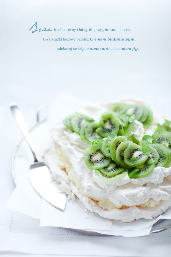 Tort bezowy to deser, który idealnie sprawdza się na przyjęciach. Wygląda efektownie i wystarczy jej mały kawałeczek aby poczuć odpowiednią dawkę słodyczy. Beza należy do moich ulubionych deserów, szczególnie przełożona masą kawową. Dzisiejsza wersja to dwa krążki bezowe przełożone kremem budyniowym (patissiere) z dodatkiem bitej śmietany dla uzyskania większej puszystości i objętości masy. Krem budyniowy to dobry sposób na wykorzystanie pozostałych po bezie żółtek. Wierzch udekorowałam samą bitą śmietaną i owocami. Z owoców zdecydowałam się na kiwi, gdyż do słodkiej bezy idealnie pasuje ich lekko kwaskowaty posmak.