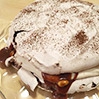 Czekoladowa beza przełożona kremem z masła orzechowego i polana sosem toffee z prażonymi solonymi orzeszkami ziemnymi.