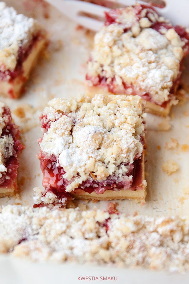 - Na podpieczony spód wyłożyć masę serową i wstawić z powrotem do piekarnika. Piec przez 15 - 20 minut aż masa serowa się zetnie. Wyjąć ciasto z piekarnika i zwiększyć temp. w piekarniku do 180 stopni C. Na warstwę serową wyłożyć truskawki i posypać kruszonką. Wstawić do piekarnika na 35 minut.