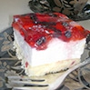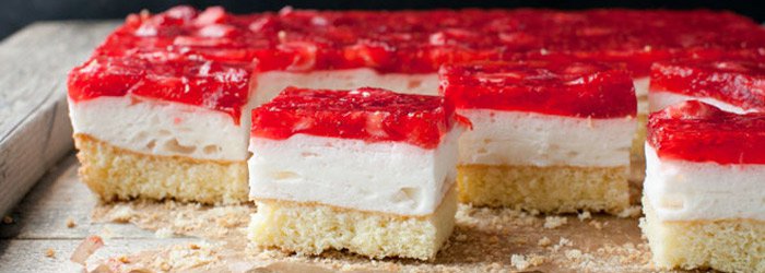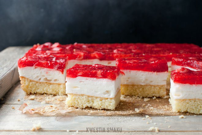 To lekkie ciastko na puszystym biszkopcie, z białą pianką z jogurtu greckiego i ubitych białek oraz galaretki truskawkowej z rozdrobnionymi truskawkami. Biała pianka to sposób na wykorzystanie białek jaj pozostałych z innych wypieków. Możecie ją wykorzystać w dowolny sposób w deserach i ciastach, np. wyłożyć na owoce i po zastygnięciu odwrócić ciasto do góry dnem. Swój deser wykończyłam truskawkową galaretką z kawałkami owoców.