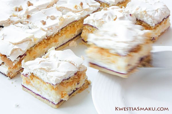 Pani Walewska to zgrane połączenie kruchego i cieniutkiego ciasta, słodkiej i chrupiącej bezy, kremowej masy budyniowej i kwaskowatego dżemu z czarnej porzeczki. Te wszystkie smaki i różne struktury wspaniale się uzupełniają i współgrają. Polecam!