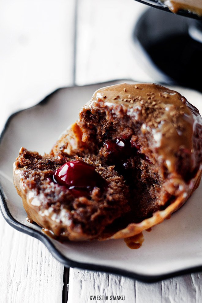 Babeczki z mleczną czekoladą, wiśniami i polewą z solonego kajmaku