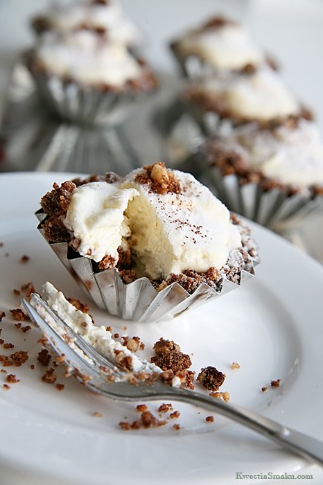 - Rozpuszczam masło z czekoladą i dodaję do dokładnie zmielonych lub pokruszonych ciastek. Wykładam nimi foremki (metalowe, silikonowe lub w formie na muffiny z papilotkami. Wstawiam do lodówki.