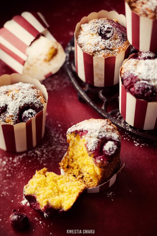 - Ciasto wyłożyć do papilotek, na wierzchu można położyć po 3 wiśnie. Wstawić do piekarnika i piec przez około 18 - 20 minut, do suchego patyczka. Posypać cukrem pudrem.