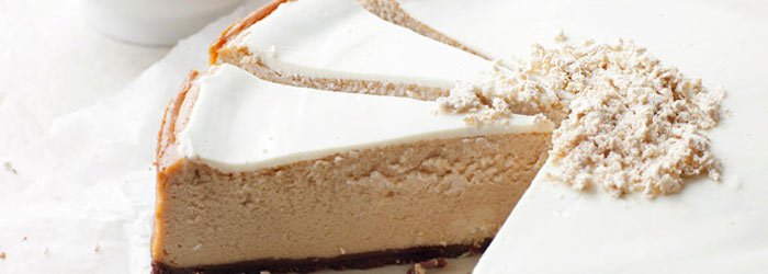 Idealnie kremowy sernik kawowo-chałwowy na spodzie z maślanych, kakaowych ciasteczek, udekorowany pokruszoną chałwą i konfiturą (lub frużeliną) wiśniową.
