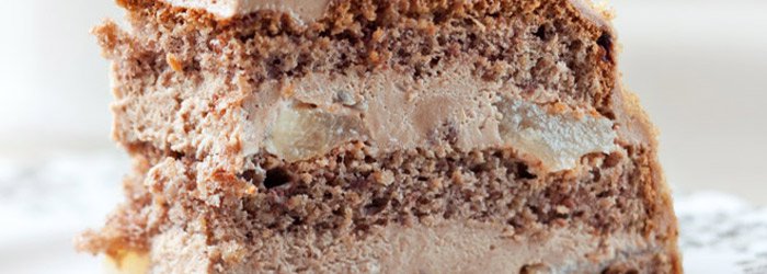 - Pierwszy dolny blat położyć na paterze, skropić 1/3 nasączenia (ostudzonego!) ułożyć połowę pokrojonych gruszek lub rozsmarować 3 łyżki konfitury gruszkowej. Przykryć 1/3 musu i położyć drugi blat tortu. Znów skropić nasączeniem, położyć gruszki i mus. Znów kolejny blat, nasączenie i mus po wierzchu i na boki tortu. Wstawić do lodówki. Po około pół godzinie gdy mus zacznie sztywnieć udekorować boki zmielonymi orzechami a wierzch wiórkami z mlecznej czekolady. Wstawić do lodówki do zastygnięcia na około 2 godziny lub do czasu podania. Najlepiej na całą noc.