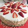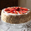 Lekki torcik z warstwą musu truskawkowego pomiędzy dwoma blatami puszystego biszkoptu. Wierzch udekorowany plasterkami świeżych truskawek, boki obsypane mielonymi orzechami laskowymi.