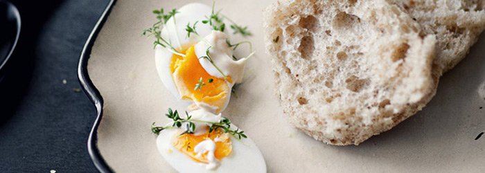 Propozycja podania: masło do posmarowania bułeczek, majonez i perfekcyjnie ugotowane jajko, rzeżucha, sól morska i świeżo zmielony czarny pieprz
