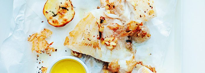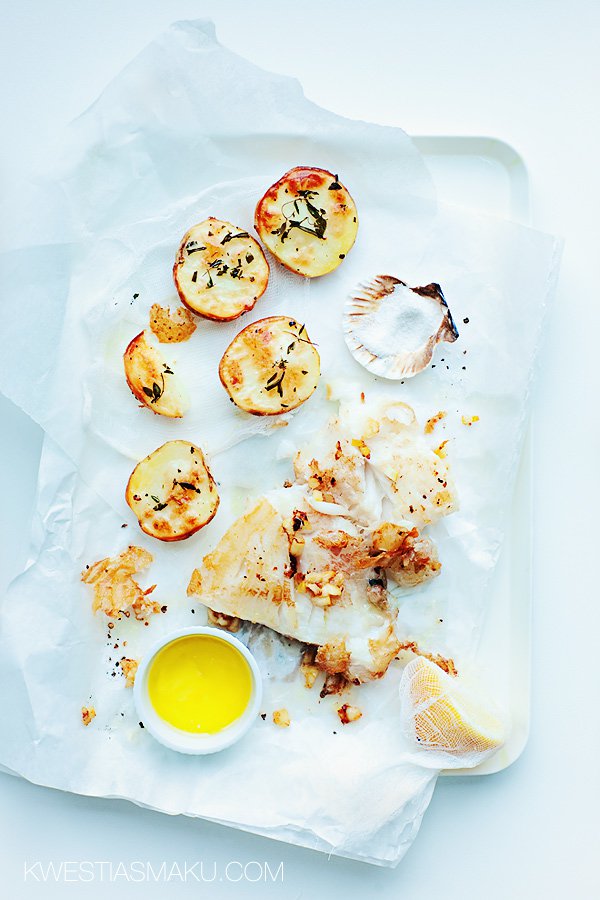 Do ziemniaków - pieczona biała ryba, może być dorsz, halibut lub sola, doprawione skórką cytrynową i roztopionym masłem. To nasz ulubiony zestaw obiadowy na szybko, taka zdrowsza wersja angielskich fish & chips, czyli ryby smażonej w panierce i frytek.