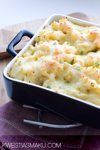 - Odsączyć, chwilę odparować, dodać mleko i gałkę muszkatołową, zrobić gładkie purée praską do ziemniaków. Doprawić solą oraz pieprzem.
