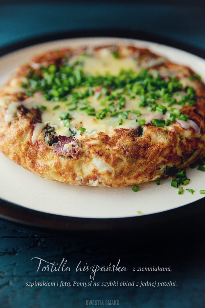 Omlet z ziemniakami, szpinakiem i fetą, smażony jak oryginalna hiszpańska tortilla de patatas. Na koniec posypana tartym serem.