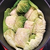 - Wyciąć głąb ze środka kapusty, następnie włożyć ją do dużego garnka z wrzątkiem (wyciętą stroną do dołu), gotować przez około 10 minut na małym ogniu. Przewrócić kapustę na drugą stronę i gotować przez ok. 5 minut. Wyjąć kapustę z wrzątku i po przestudzeniu rozebrać ją z liści, odciąć delikatnie zgrubienia z każdego liścia, następnie nakładać przygotowane porcje mięsa.