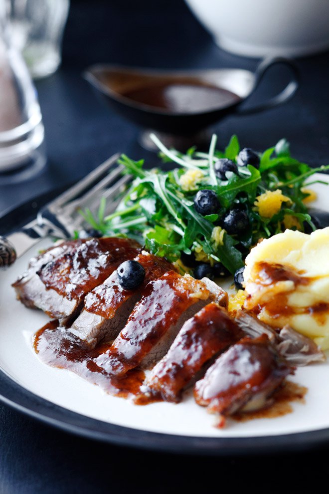 To mój niezawodny sposób na upieczenie kaczki, z cienką i chrupiącą skórką oraz miękkim i łatwo odchodzącym od kości mięsem. Dodatkowym atutem jest brak intensywnych zapachów w kuchni (kaczkę pieczemy w garnku pod przykryciem) oraz zmniejszona ilość wytapianego tłuszczu (nadmiar wycinamy jeszcze przed pieczeniem). Mięso po upieczeniu jest soczyste i pyszne. Można podawać je z dowolnymi dodatkami, bardziej lub mniej klasycznymi. Znacie już opiekane ziemniaczki czy pieczone jabłka z żurawiną, dzisiaj chciałabym zaproponować Wam coś innego - purée ziemniaczane ale z dodatkiem wasabi (jak do sushi!) oraz sałatkę z rukoli, mango i pysznego winegretu imbirowego. Do kaczki proponuję domowy sos śliwkowy, doprawiam go ostrą papryką w proszku i jest naprawdę o wiele smaczniejszy niż wszelkie gotowe sosy.