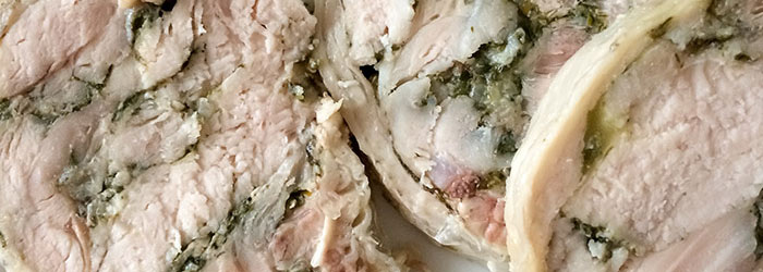 Domowa gotowana wędlina w kształcie rolady z kurczaka, z natką i koperkiem.