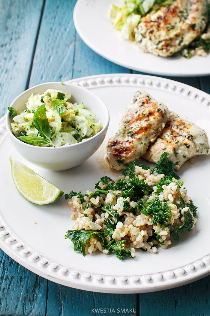 Filety z kurczaka w ziołach z surówką z kopru włoskiego i brązowym ryżem smażonym z jarmużem. Dużo zielonego na talerzu, w myśl zasady aby 50% obiadu stanowiły warzywa (nie chodzi tutaj o ziemniaki ;-) 25% białko i 25% węglowodany złożone.