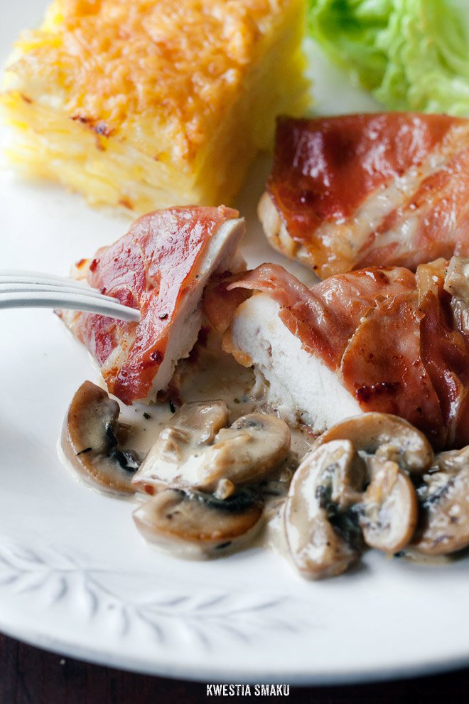 Proste składniki ale z nutką odświętnego charakteru - suszona szynka (parmeńska, szwarcwaldzka, serrano), ładnie zrumieniona, która zabezpiecza mięso przed wysuszeniem, oraz kieliszek brandy do sosu pieczarkowego. Dodatkowo do sosu możemy dodać kilka kawałków suszonych grzybków, wzbogacą jego smak. Ja dodaję też musztardy (zarówno do sosu jak i do kurczaka, smaruję nią filety przed zawinięciem w szynkę). Filety są cieniutkie i nieduże, usmażmy je na dobrej jakości maśle, a danie zyska dodatkowy smak i aromat a przy tym nic nam się nie przypali. Pamiętajmy aby smażyć mięso na niedużym ogniu.