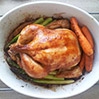 - Kurczaka położyć na jednym boku na kratce w brytfance, wstawić do piekarnika i piec przez 25 minut. Przewrócić kurczaka na drugi bok i piec przez następne 25 minut. Wyjąć naczynie z kurczakiem, wylać wytopiony tłuszcz. Ułożyć z powrotem kurczaka na kratce w naczyniu (lub na marchewkach), tym razem piersiami do góry. Wstawić z powrotem do piekarnika i piec przez 55 minut. Cały czas kurczaka pieczemy bez przykrycia.