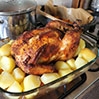 - Na pół godziny przed końcem pieczenia do naczynia z kurczakiem włożyć paprykę i ugotowane ziemniaki, doprawione solą, pieprzem, suszonym oregano i wysmarowane oliwą extra vergine. Przed włożeniem warzyw można zlać z naczynia wytopiony z kurczaka tłuszcz (cały lub połowę). Wyjąć z piekarnika i odczekać 15 minut przed pokrojeniem kurczaka na porcje.