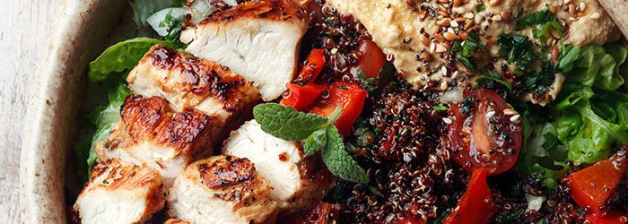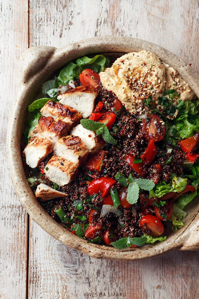 admin Sałatka z komosą ryżową, grillowanym kurczakiem, papryką i hummusem