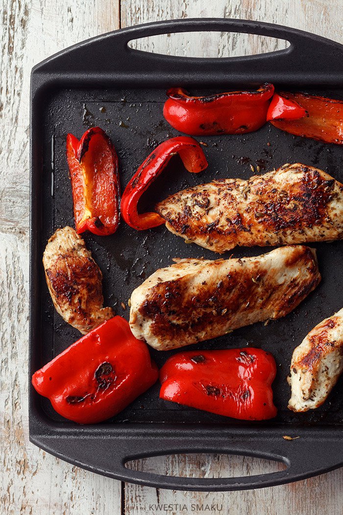 - Rozgrzać patelnię z grubym dnem lub patelnię grillową. Włożyć na nią kurczaka oraz paprykę. Mięso obsmażać z każdej strony po ok. 2 minuty (w sumie 8 minut), paprykę raz przewrócić, następnie wstawić do nagrzanego piekarnika i piec jeszcze przez 10 minut. Wyłożyć na deskę.
