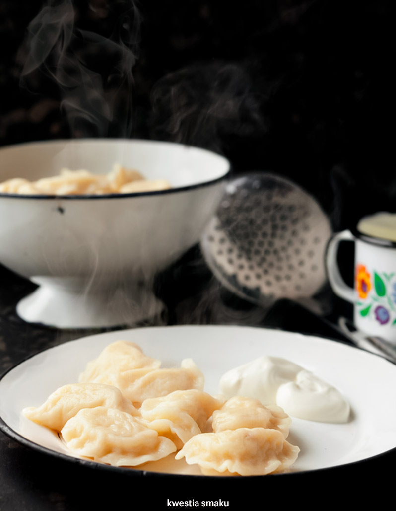 - Pierogi wyławiać łyżką cedzakową i układać na talerzach. Od razu podawać lub po obeschnięciu schować do pojemników i przechowywać w lodówce. Można też zamrozić.