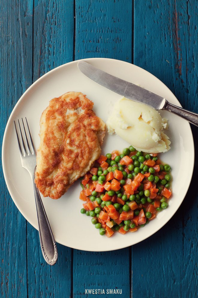 Wspomnienie dzieciństwa, dla wielu być może nadal jeden z ulubionych zestawów obiadowych :-) Dobrze zrobiony kurczak w panierce nie jest zły. Usmażony na dobrze rozgrzanej grubej patelni nie chłonie tłuszczu, jest soczysty w środku i chrupiący na zewnątrz. Podawany z kolejną "klasyką" — marchewką z groszkiem i tłuczonymi ziemniakami. W wersji light polecam samą pierś kurczaka na marchewce z groszkiem już bez ziemniaków, taka "sałatka na ciepło" :-)