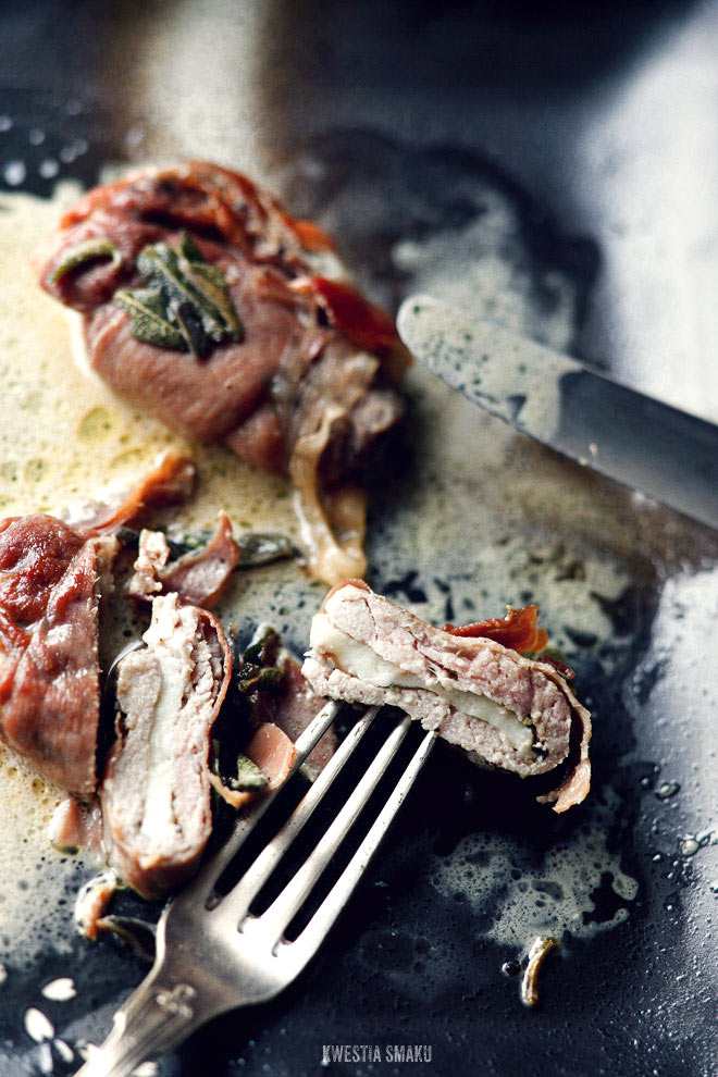 - Polędwicę oczyścić z włókien i pokroić w poprzek na 1 cm kawałki. Roztłuc tłuczkiem na cieńsze filety. Natrzeć czosnkiem, oprószyć solą (niedużo, bo szynka jest słona) i świeżo zmielonym pieprzem.
