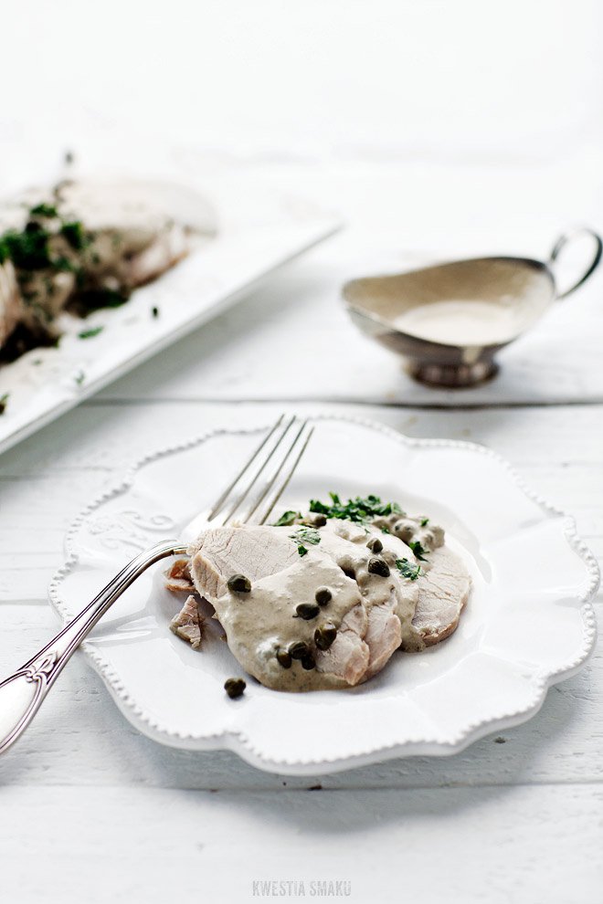 Schab cielęcy gotowany w winie podawany z sosem tuńczykowym.