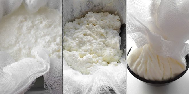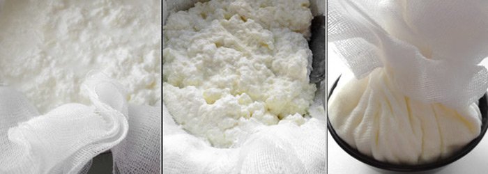 - Zebrać z mleka większe kawałki "sera" za pomocą łyżki cedzakowej i przenieść je na sitko, następnie przelać przez sitko resztę mleka (wlewać delikatnie przy brzegu sitka a nie po zebranym serze).