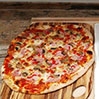 W rogu stolnicy wysypać pół szklanki mąki. Środek stolnicy i dłonie oprószyć mąką. Delikatnie wyjąć jedną porcję ciasta z miski (będzie się kleiło). Ciasto włożyć w przygotowaną mąkę i obtoczyć z jednej i drugiej strony, otrzepać z nadmiaru mąki. Delikatnie, rozciągając od środka uformować kilkunasto-centymetrowy placek (brzegi mają być delikatnie wyższe). Podnieść ciasto do góry, rozłożyć na skierowanych do góry zaciśniętych pięściach i obracać lekko rozciągając (należy uważać aby nie przerwać ciasta) do szerokości placka ok. 25 cm. Ciasto wyłożyć na oprószoną mąką cienką łopatkę do zsuwania pizzy lub na blaszkę czy tortownicę do pieczenia. Wyłożyć sos pomidorowy (zaczynając od środka pizzy, ruchami okrężnymi), następnie ser (ok. 1/2 szklanki) oraz dodatki. Zsunąć do piekarnika na kamień lub wstawić blaszkę do piekarnika i piec ok. 8-9 minut.