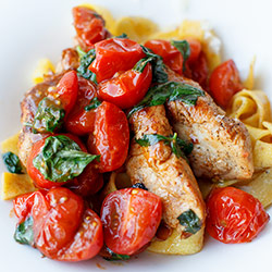 Kurczak z makaronem, pomidorkami koktajlowymi i bazylią 0