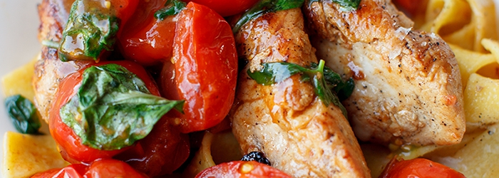 Kurczak z makaronem, pomidorkami koktajlowymi i bazylią